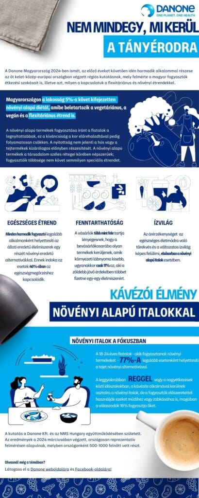 A Danone Magyarország 2024-ben ismét részt vett az öt kelet-közép-európai országban végzett régiós kutatásban, mely a fogyasztók étkezési szokásait és növényi alapú étrendekhez való viszonyát vizsgálta, valamint azt, hogy mely termékeket helyettesítik leggyakrabban nem állati eredetű összetevőkkel.