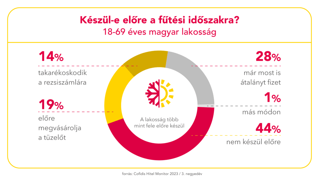 A Cofidis Hitel Monitor felmérés rámutat: a magyarok mintegy negyede gondolja úgy, hogy a múlt évhez képest az idei fűtési szezonban többet kell majd kigazdálkodnia, átlagosan 124 ezer forinttal. Erre a lakosság több mint fele előre készül: takarékoskodik a rezsiszámlára (14%), előre megvásárolja a tüzelőt (19%), illetve már most is átalányt fizet (28%).