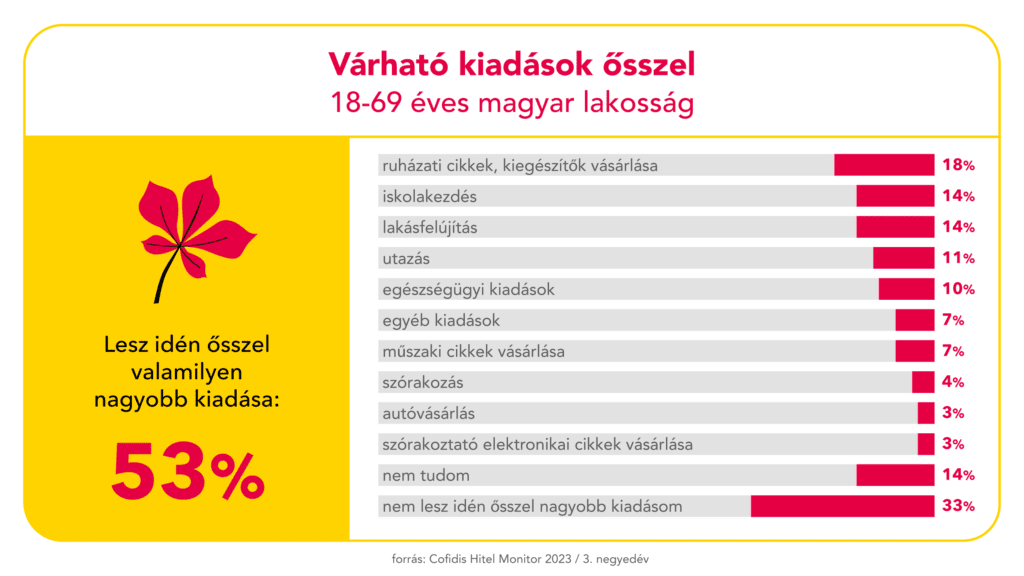 A hitelspecialista vállalat harmadik negyedéves felmérése során a szezonális költésekkel kapcsolatos várakozásokat vizsgálta. Az 1000 fős mintán végzett kutatás eredményei alapján a lakosságnak már kettőnél többször kell nagyobbra nyitni a pénztárcát az év során. Habár a legtöbben karácsonykor és a nyári szezonban lépik túl a szokásos havi keretüket, az őszi kiadások szintén megterhelik az amúgy is hiányos családi kasszát. A magyarok 53 százaléka számít még idén ősszel jelentős extra kiadásra: a legnagyobb tételeket a ruházati cikkek, az iskolakezdés, a lakásfelújítás, az utazás és az egészségügyi kezelések jelentik.