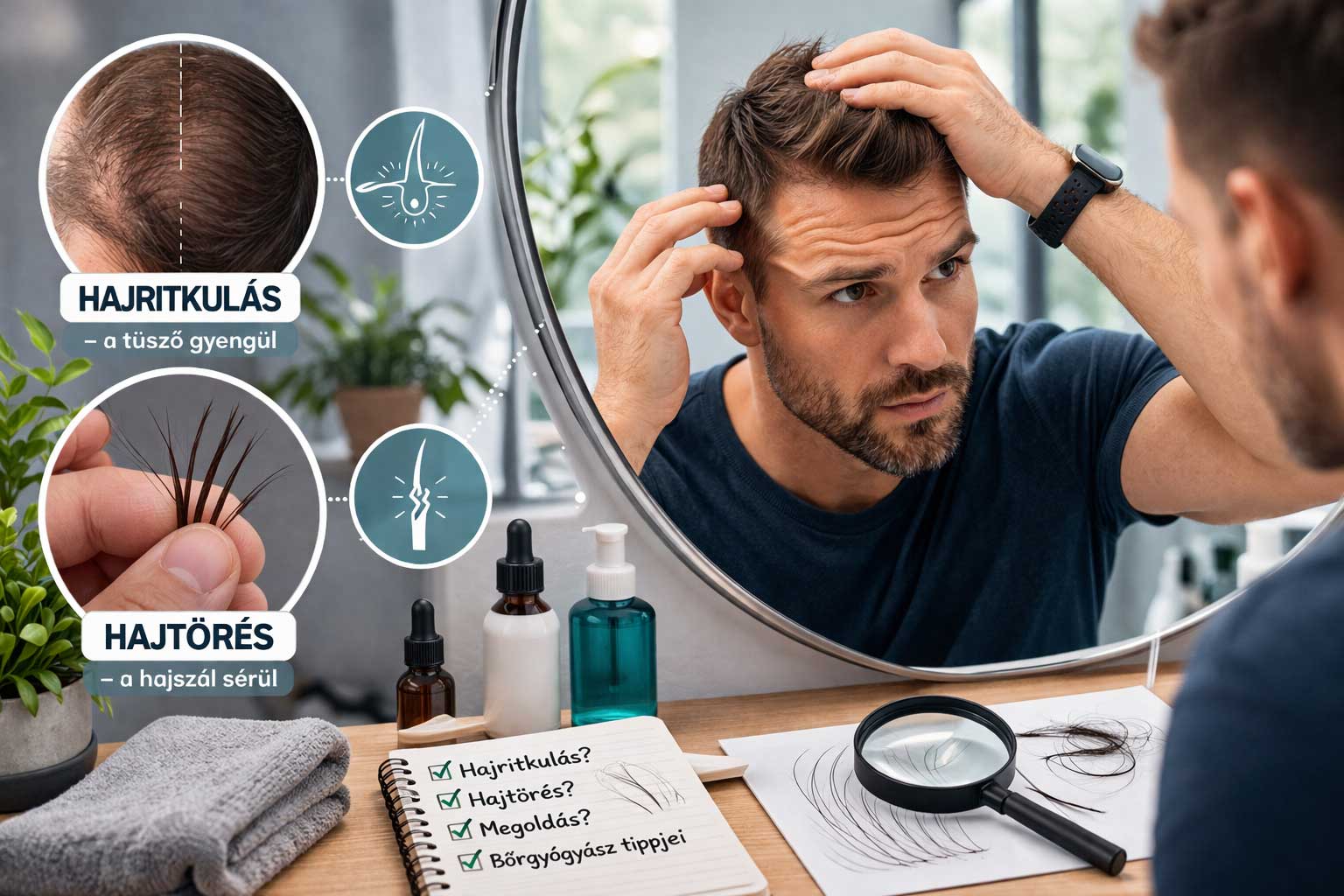 A harminc felett járó férfiak jól ismerik a jelenséget: a baráti összejöveteleken előbb-utóbb mindenki megvizsgálja a másik fejtetőjét, nem is olyan titokban. De amit ilyenkor sokan figyelmen kívül hagynak: nem minden hajhullás ugyanolyan. A két fő típus – a hajritkulás és a hajtörés – egészen eltérő kezelést igényel, és ha rosszat választasz, legfeljebb időt és pénzt pocsékolsz.