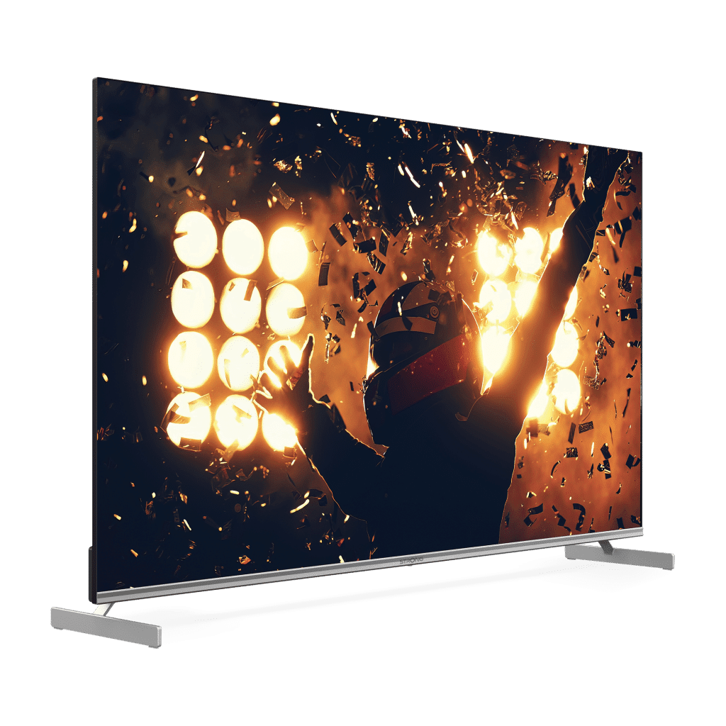 A televízió designja azonnal elárulja, hogy nem egy átlagos modellről van szó. Az elegáns ezüst keret és a stílusos, vékony fém állványok emelik a készülék megjelenését, ami futurisztikus és minimalista benyomást kelt. A televízió kerete szűk, modern megjelenést biztosít, így kikapcsolva szinte láthatatlan marad.