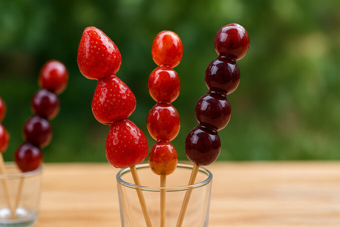 A tanghulu (糖葫芦) egy tradicionális észak-kínai édesség, ami eredetileg közönséges galagonyából (hawthorn) készült, és még a Sóng-dinasztia idejéről ismert. A modern változat változatos, szezonális gyümölcsökkel operál – eperrel, szőlővel, kivi szeletekkel. A lényege, hogy egy bambusznyársat tesznek a gyümölcsbe, és forró cukorsziruppal vonják be úgy, hogy a máz megdermed és ropogós bevonatként csillog rajta.